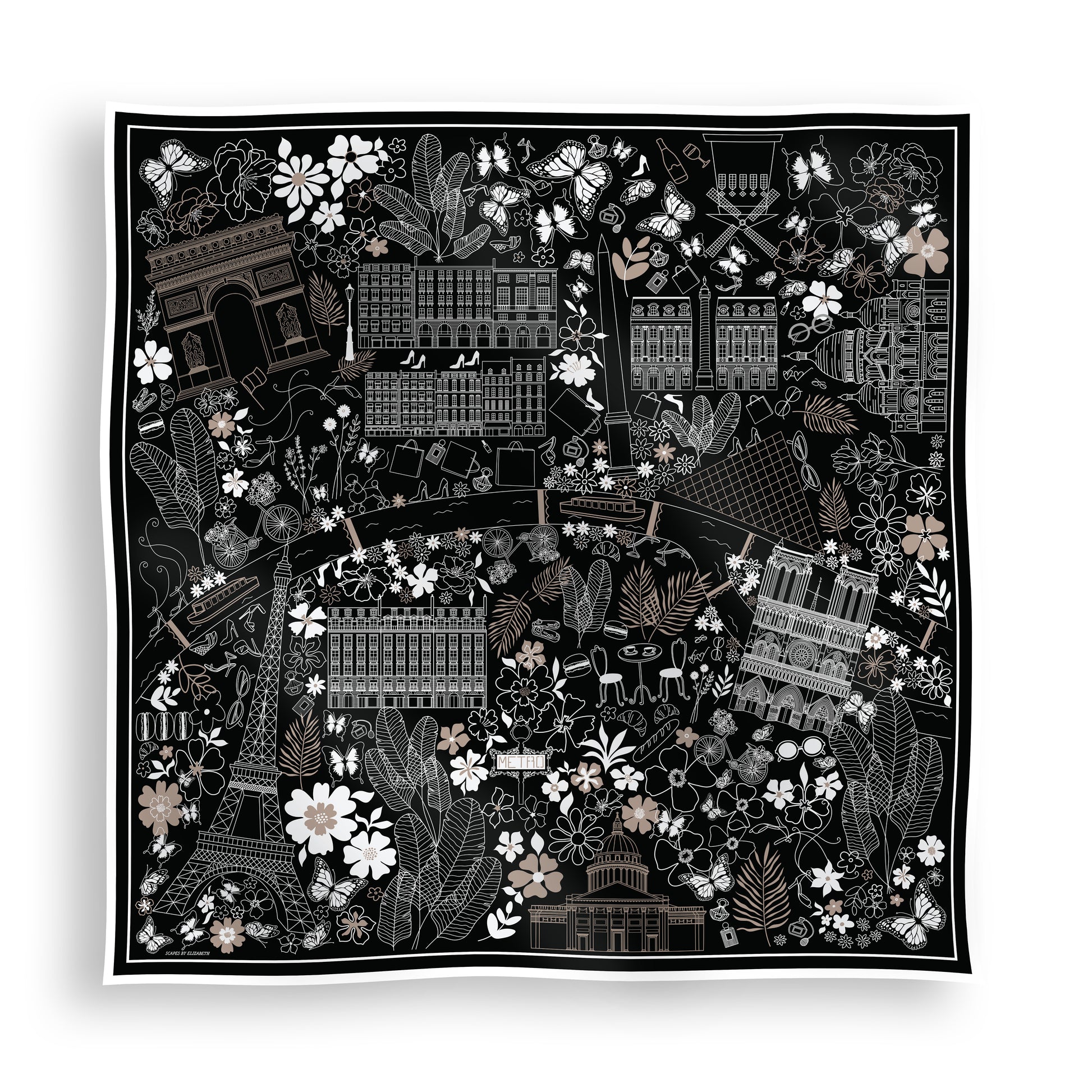 Featuring hand-drawn depictions that fashion and travel lovers will adore, this design showcases a map of Paris, highlighting iconic landmarks such as the Eiffel Tower, Moulin Rouge, and Arc de Triomphe, along with luxury boutiques and beloved symbols of Parisian fashion and cuisine.